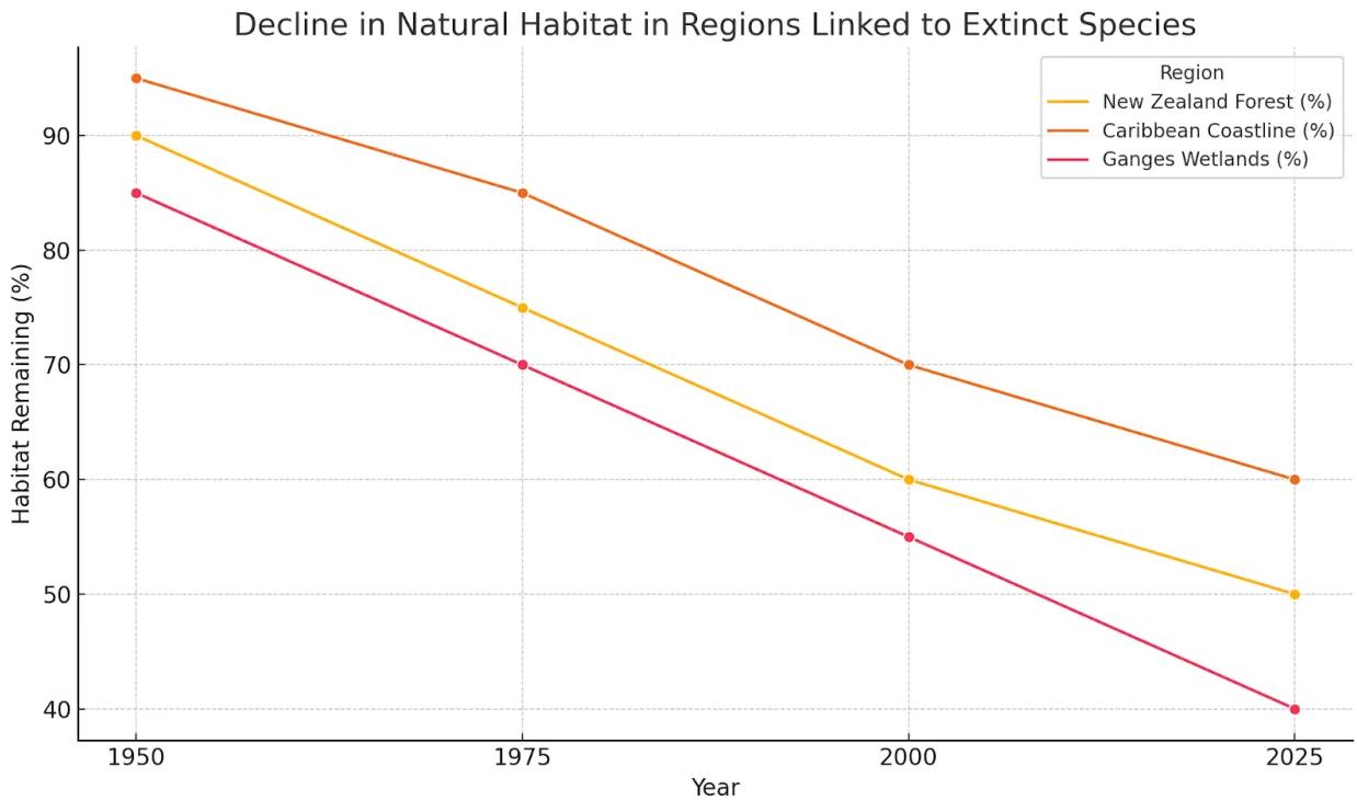 Based on the trends shown, which region is currently experiencing the most accelerated loss of suitable habitat?