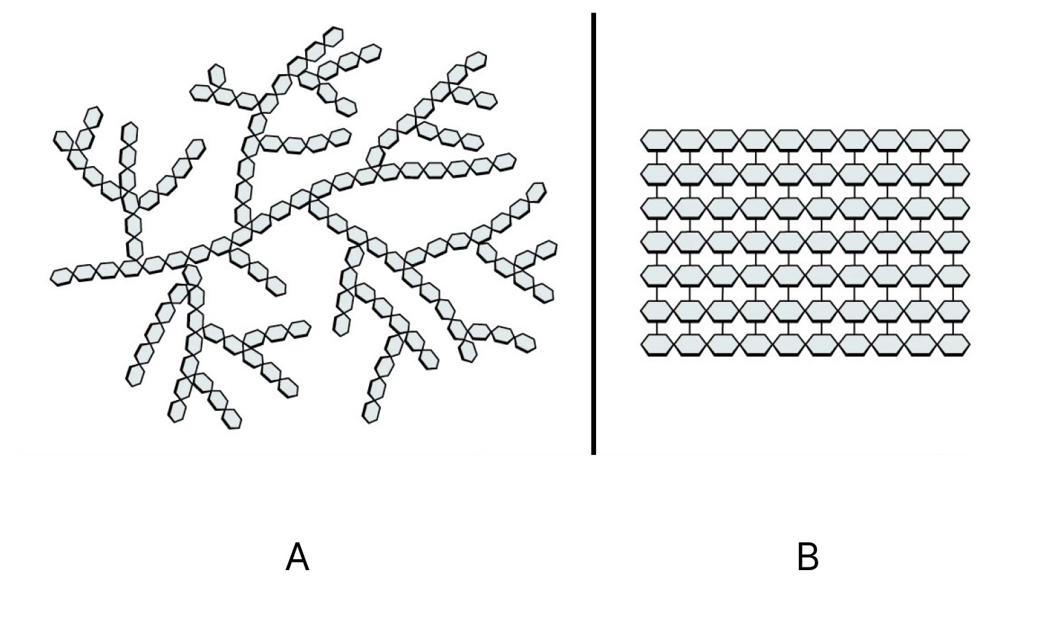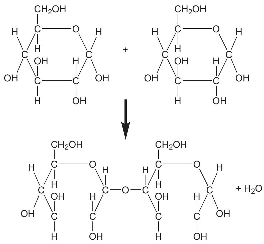 The diagrams show how monosaccharide molecules are joined to form chains in two polysaccharides.