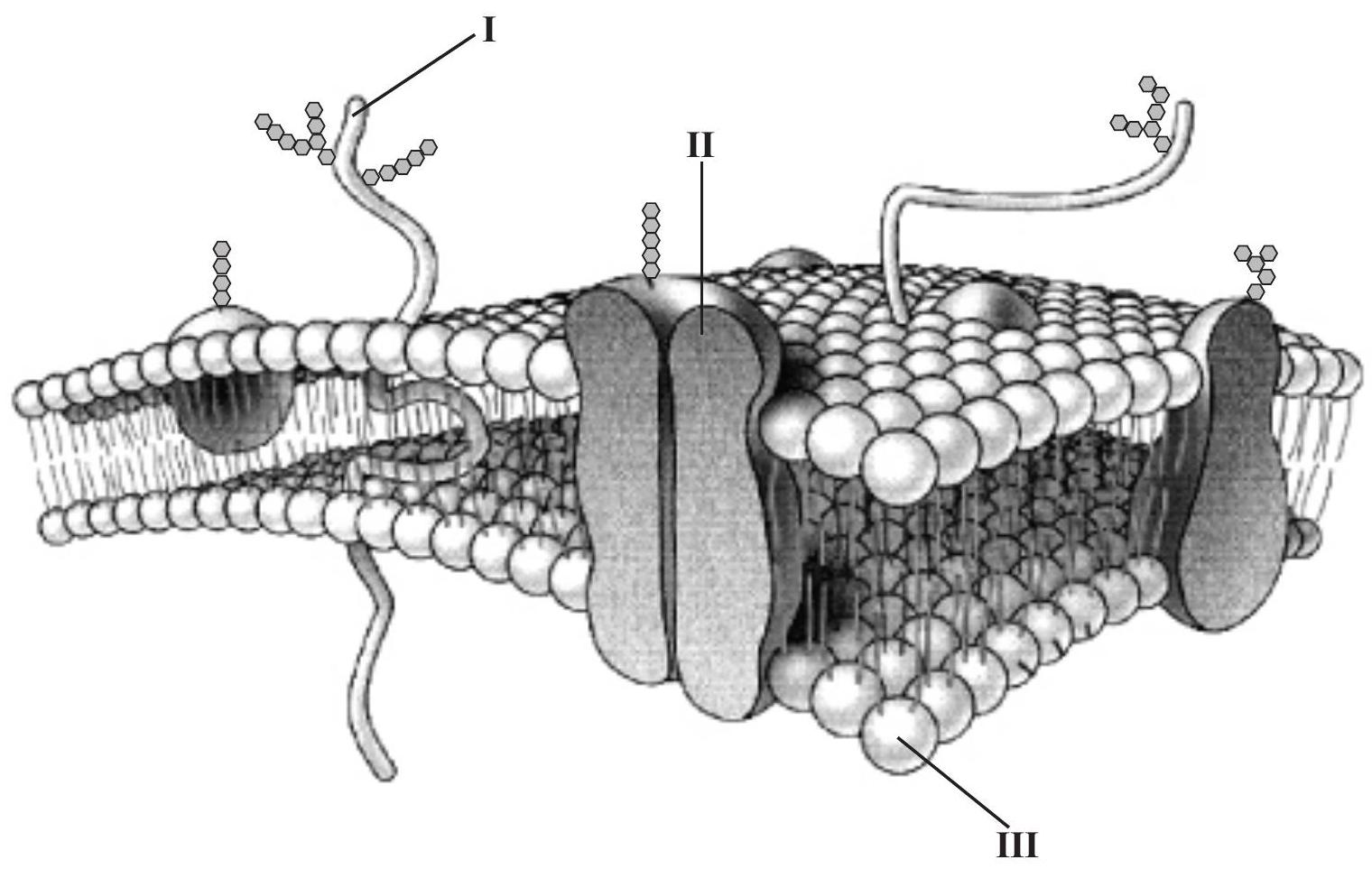 The diagram shows a model of a biological membrane. What do labels I, II, and III illustrate?