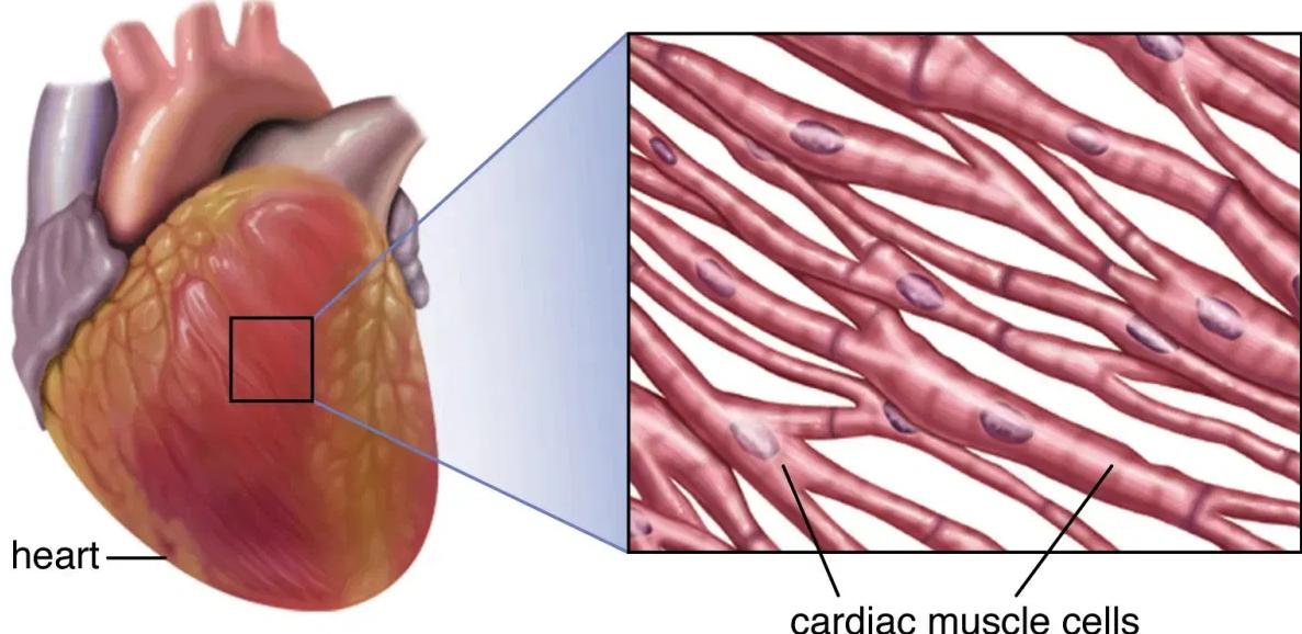 The image shows a magnified view of cardiac muscle cells from the human heart, with visible branching fibers and centrally located nuclei.