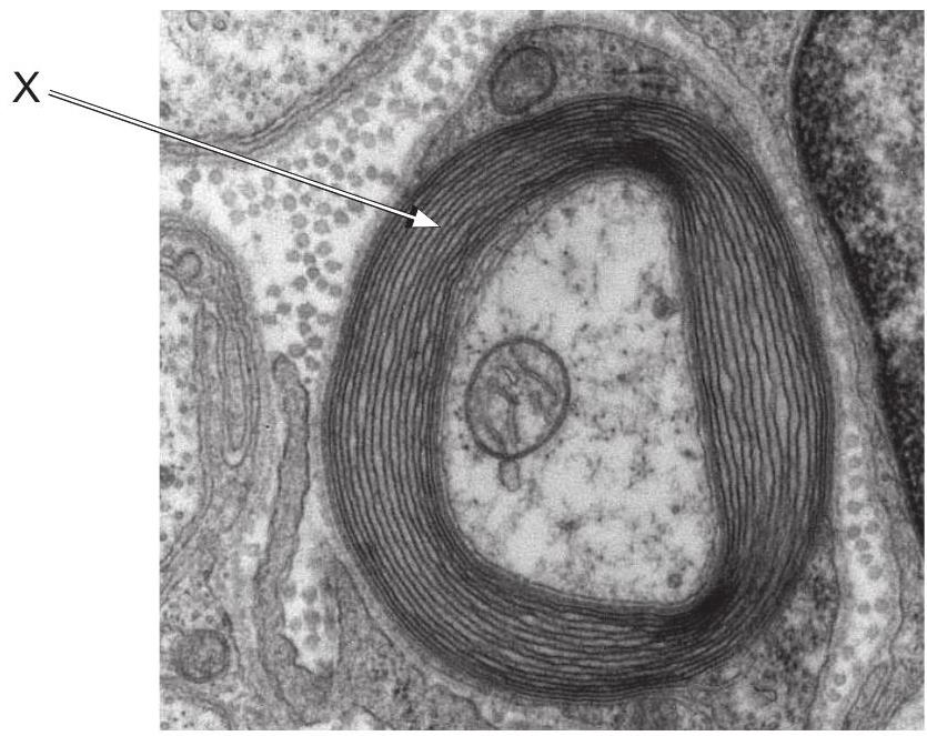 The electron micrograph shows a transverse section through a myelinated neuron.