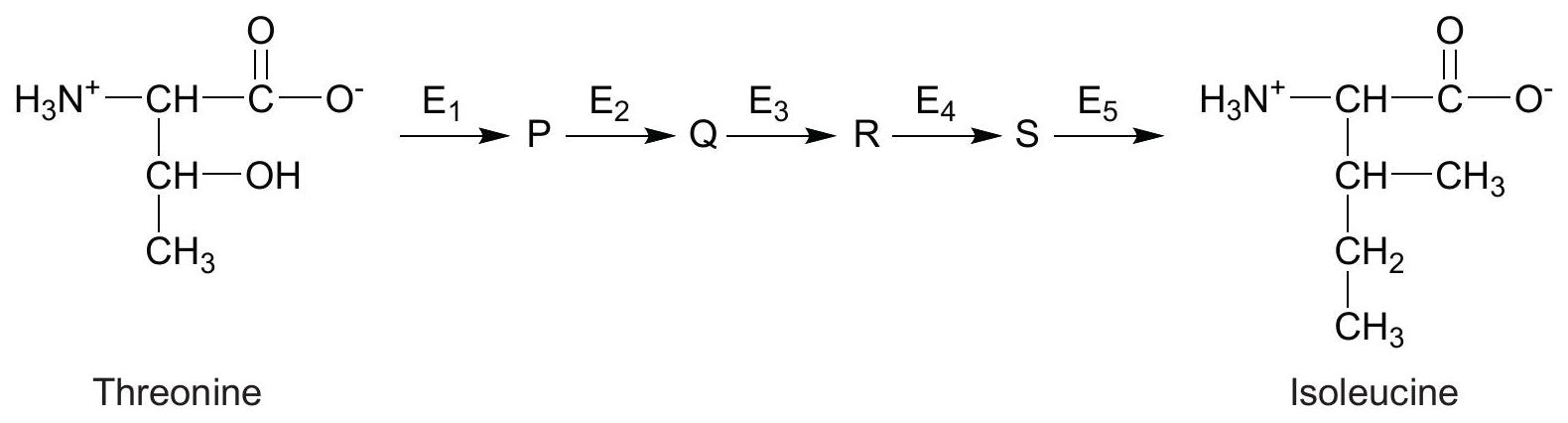 Some bacteria can synthesize the amino acid isoleucine from threonine, a process involving five enzymes ( to ) and four intermediary products (P, Q, R and S). The production of isoleucine is controlled by end-product inhibition.