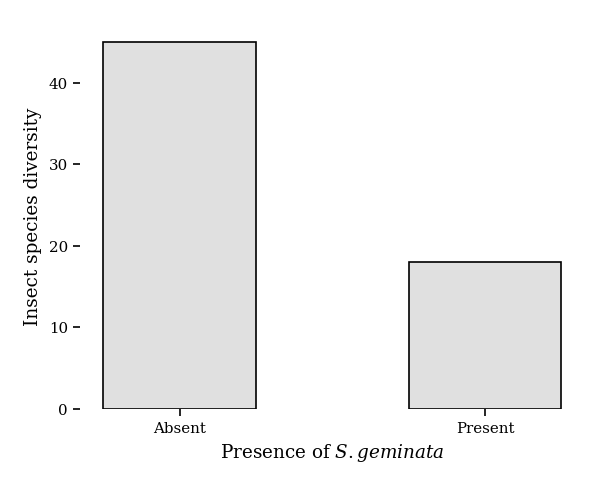 The graph shows how the presence of S. geminata can impact insect diversity in areas where crops of corn are grown.