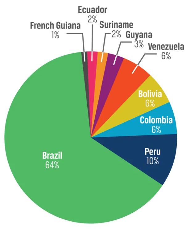 Figure b): Percentage of Amazon rainforest area in each country (2012 data).