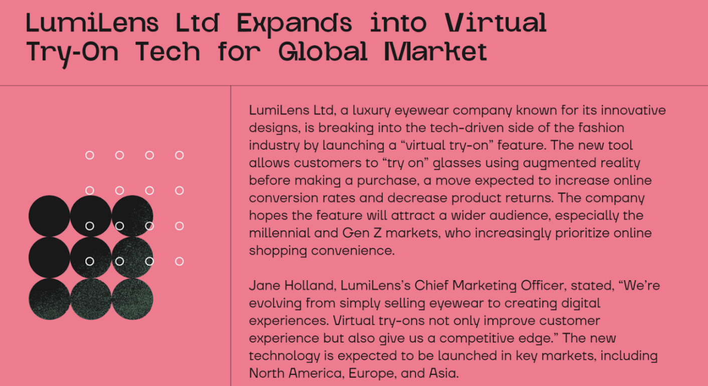 Using all the resources provided and your knowledge of business management, recommend a marketing strategy to help LumiLens increase its market share in the global eyewear industry over the next five years. Your response should consider target market segmentation, digital marketing tactics, and competitor positioning.