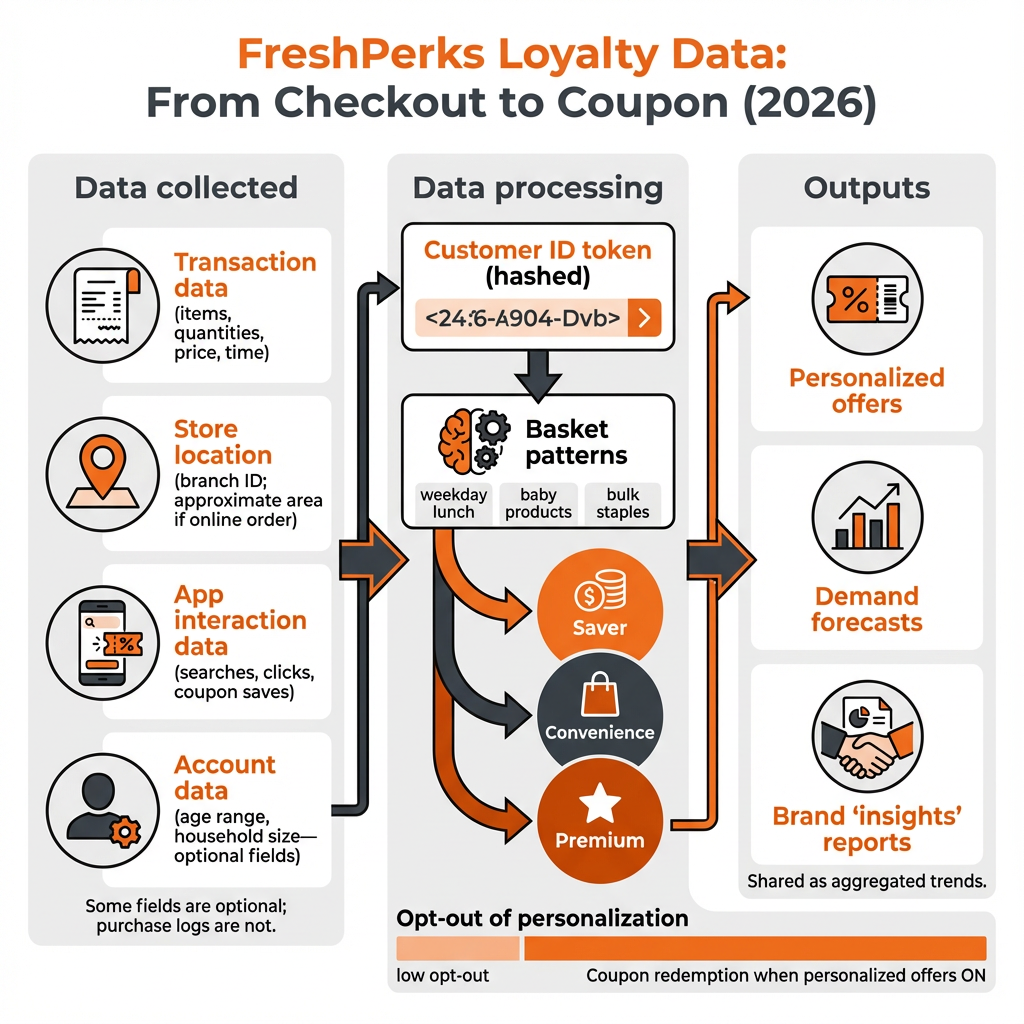 FreshPerks helps customers earn points and receive discounts that match their shopping habits. To provide these services, FreshPerks stores purchase history linked to an account identifier and uses analytics to infer product preferences (for example, dietary choices or likely household needs). Customers can turn off “personalized offers” in settings; if they do, they will still receive general promotions. FreshPerks states it does not sell individual purchase histories, but it may share aggregated insights with partner brands, such as “how many shoppers bought a product after seeing a coupon.” FreshPerks retains transaction logs for up to two years to support returns, fraud prevention, and service improvement. The company says it uses “de-identification techniques” when producing reports and that customers can request a copy of their stored data.
