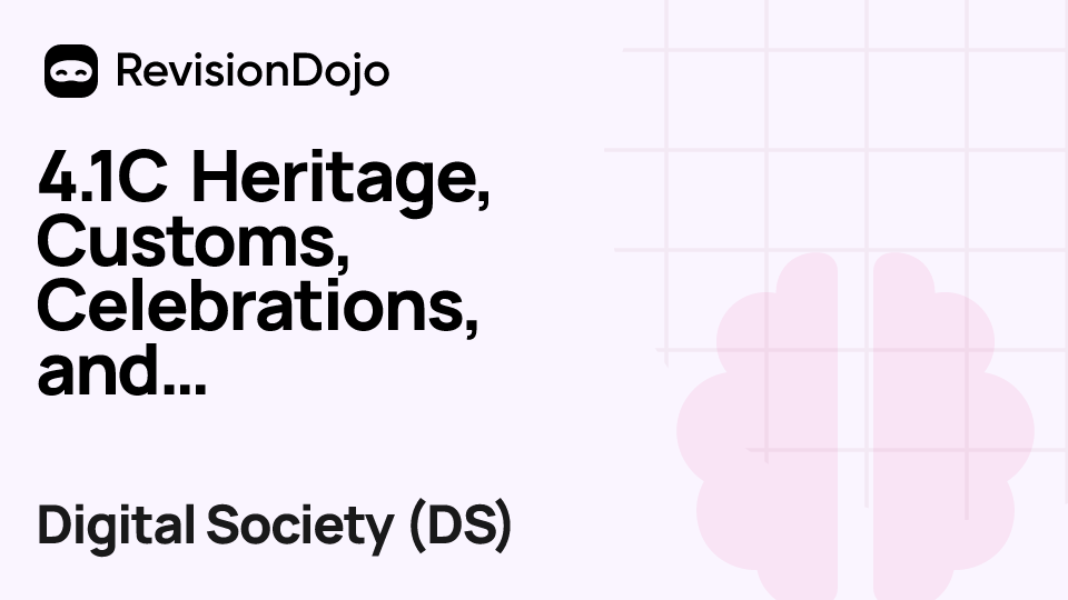 These comprehensive video lessons help IB Digital Society (DS) students Standard Level (SL) and Higher Level (HL) understand and master the essential concepts needed for success in IB Exams. Each video focuses on 4.1 Cultural and is aligned with the IB Digital Society (DS) syllabus, ensuring focused learning on systems and structures, human behavior and interaction, and digital technologies in society. Students can watch and rewatch anytime, anywhere, perfect for visual learners, reinforcing complex concepts, and understanding IB methodology. By using RevisionDojo's video lessons consistently, learners build deep understanding and enter the exam with confidence.