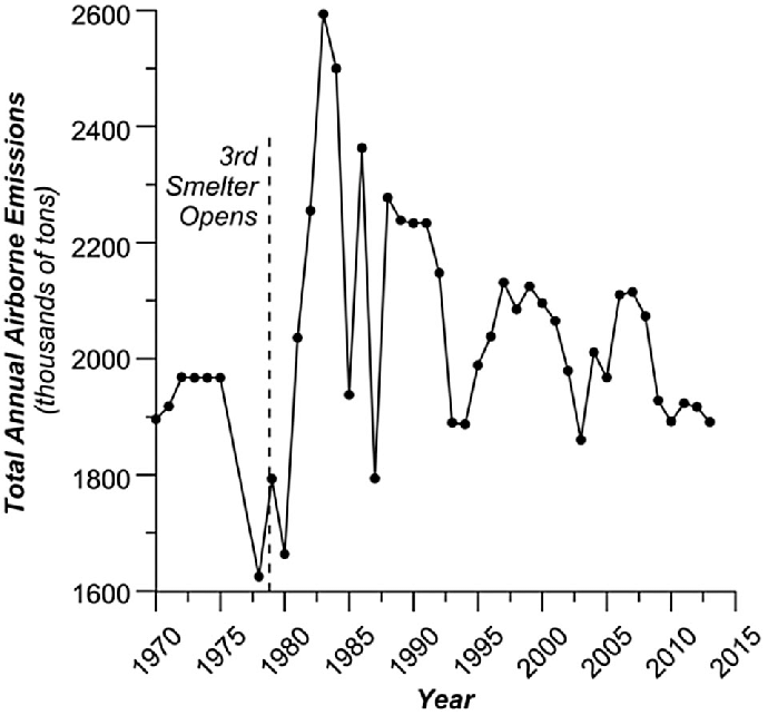 The significant increase in emissions in the early 1980s is related to the opening of the third smelter, Nadezhda, in 1979.