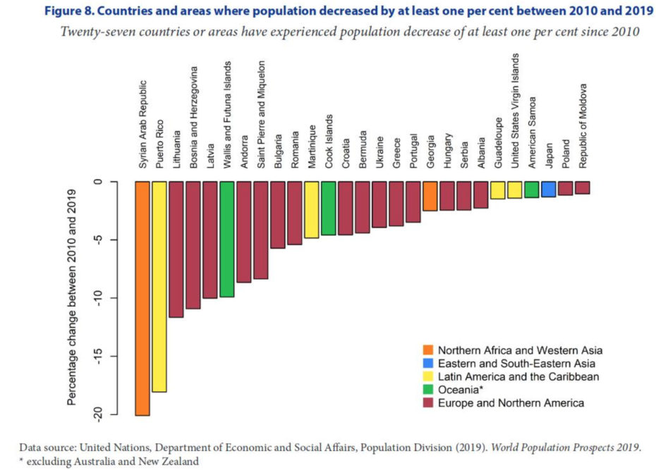 Figure 2: Countries and regions where population decreased by at least one per cent between 2010 and 2019