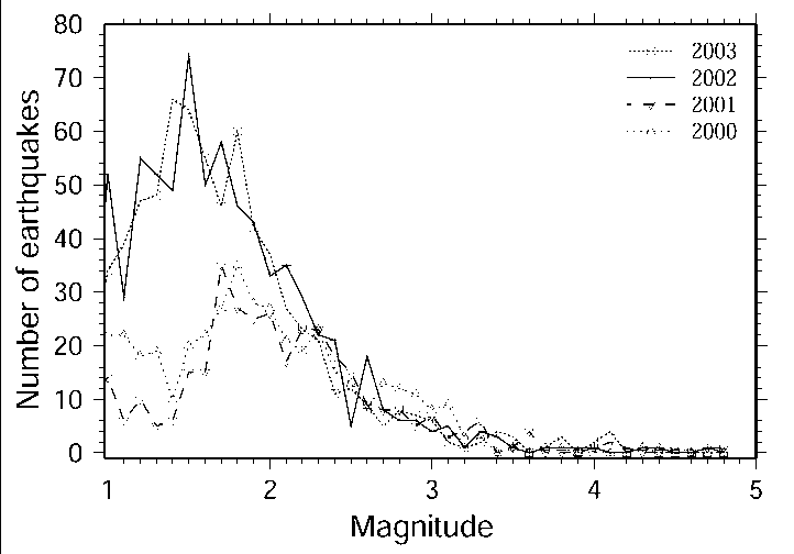 The graph shows the annual frequency distribution of earthquakes as a function of magnitude for the years 2000-2003