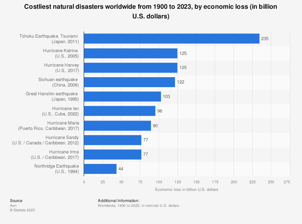 The graph below shows The Costliest Natural Disasters Worldwide from 1900 to 2023, by Economic Loss (in billion U.S Dollars)