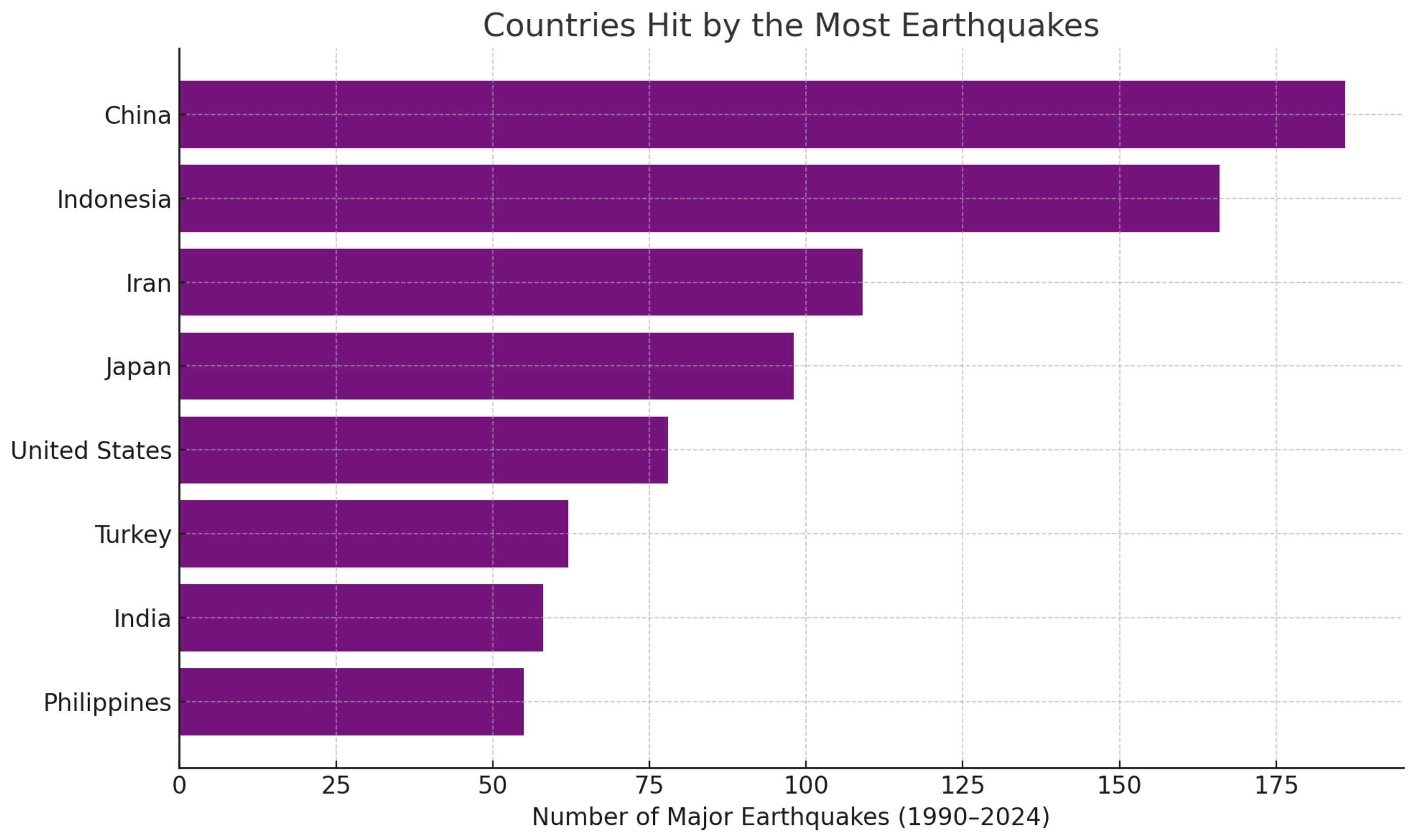 The following chart shows the countries hit by most earthquakes between 1990 to 2024
