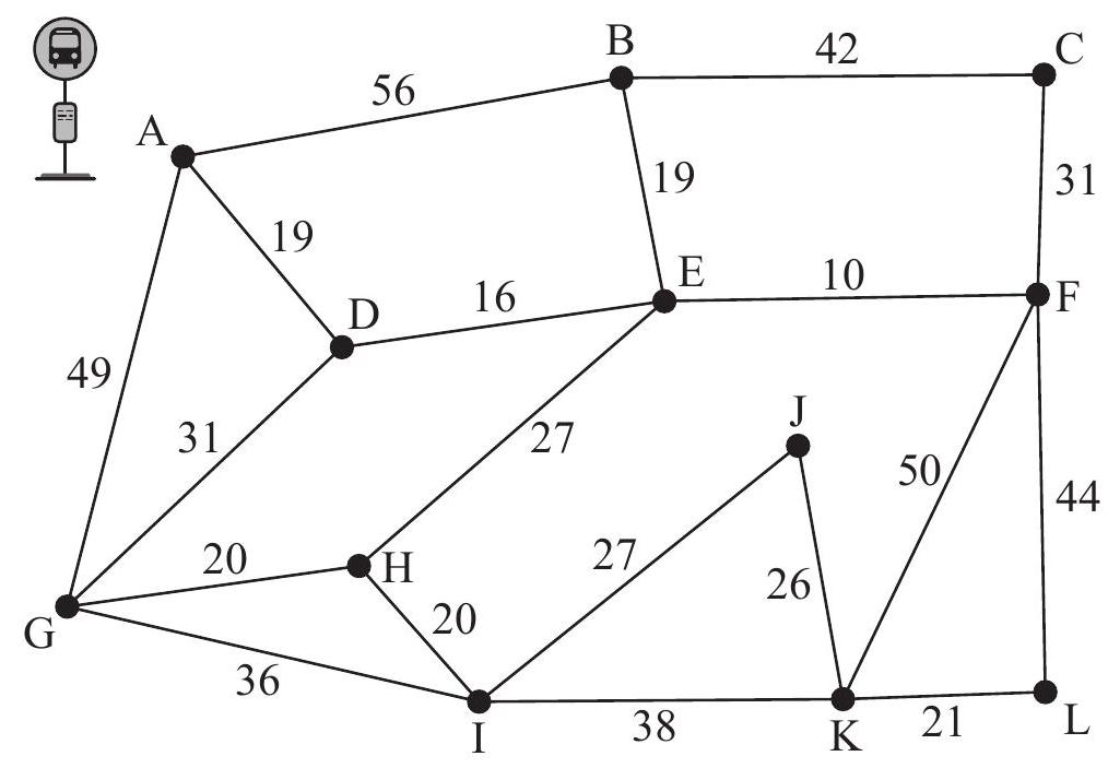 The diagram below shows a network of roads in a small village with the weights indicating the distance of each road, in metres, and junctions indicated with letters.