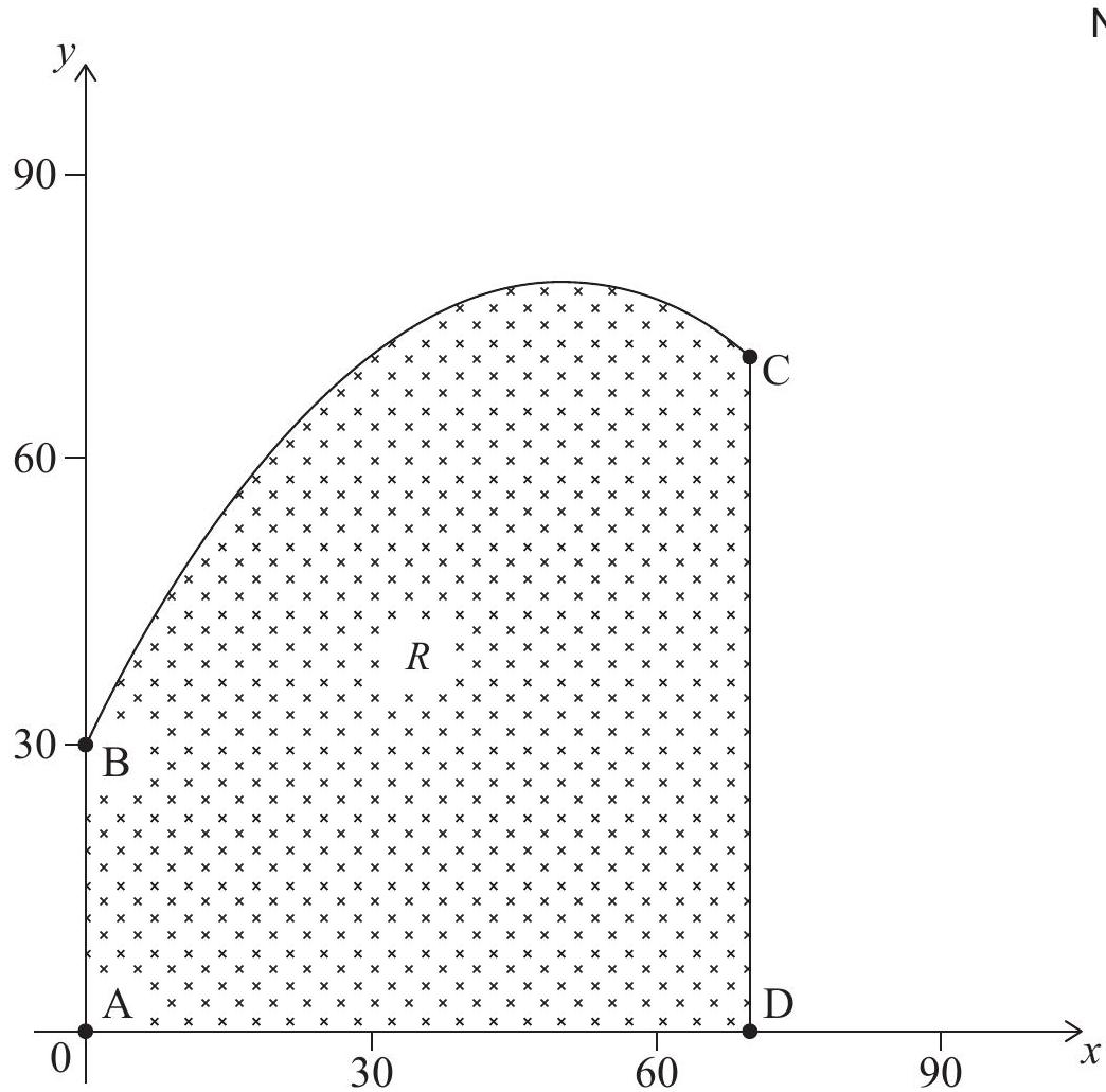 Linda owns a field, represented by the shaded region . The plan view of the field is shown in the following diagram, where both axes represent distance and are measured in metres.