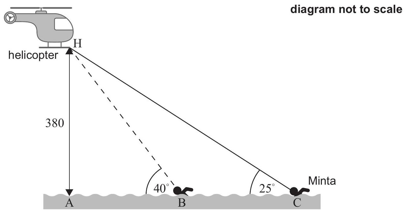 The diagram below shows a helicopter hovering at point H, 380 m vertically above a lake. Point A is the point on the surface of the lake, directly below the helicopter.