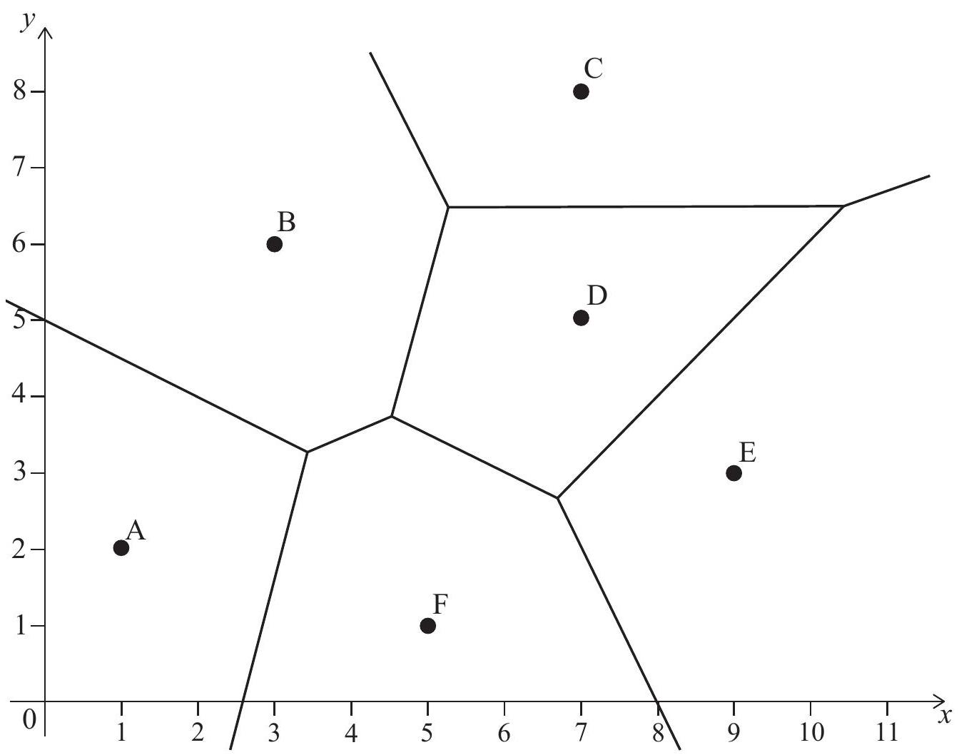 The diagram below shows a Voronoi diagram formed by five points: , , , , and . Each region corresponds to the area closest to one of the points.