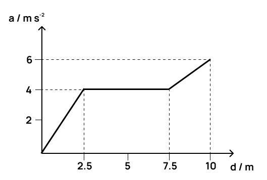 A force acts on a box of mass 10 kg. The graph below shows how the acceleration of the box varies with its displacement .