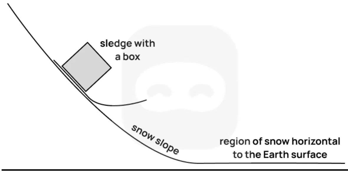 A sledge carrying a box slides down a smooth snow slope, starting from rest at the top. The slope curves smoothly until it becomes horizontal, as shown.