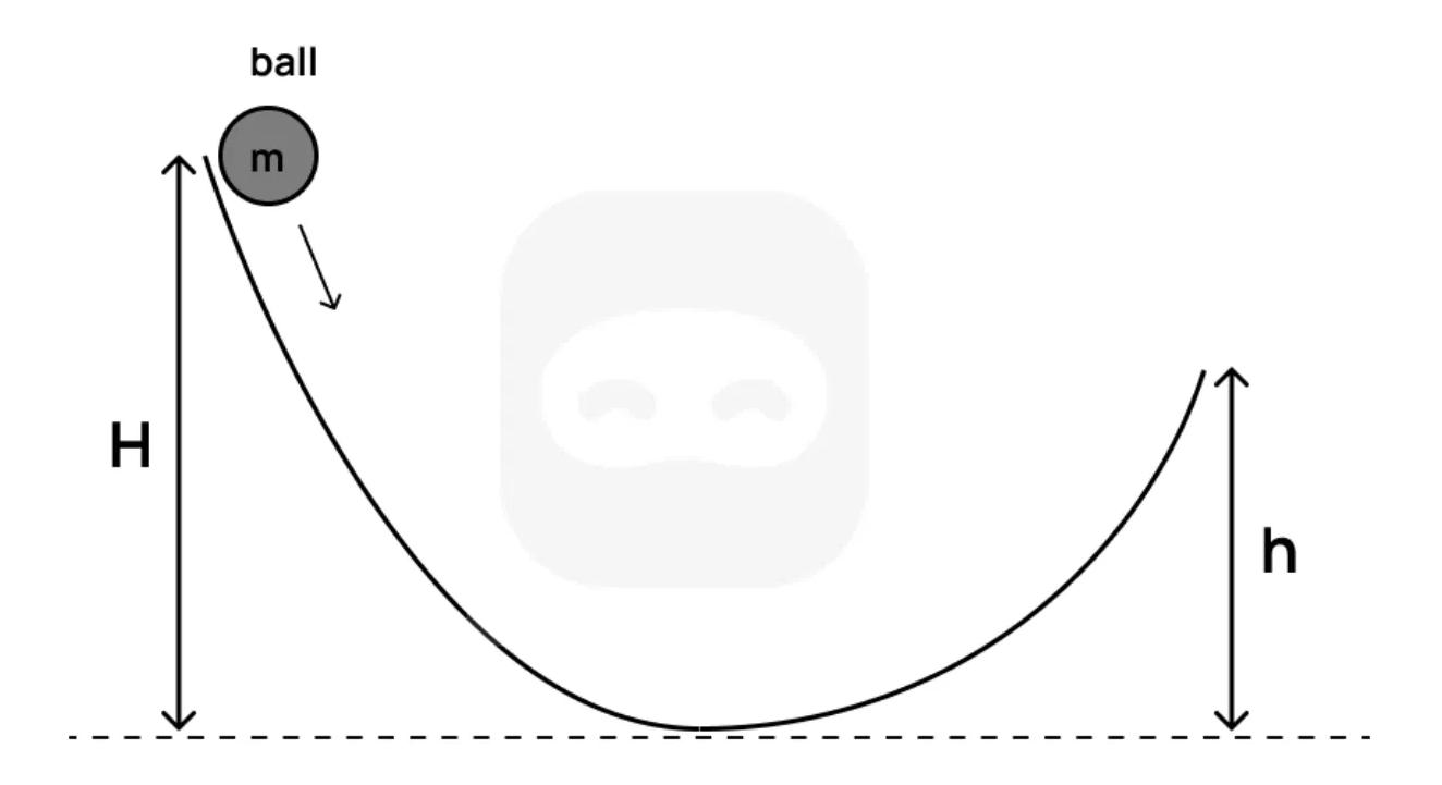 A ball of mass is released from rest at a height above the ground. It slides down a smooth curved surface and rises up to a height on the opposite side.
