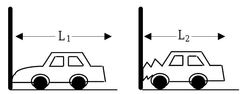In order to measure collision forces a car is crashed head-on into a flat, rigid barrier and the resulting crush distance is measured. The crush distance is the amount that the car collapses in coming to rest. In the above diagram the crush distance .