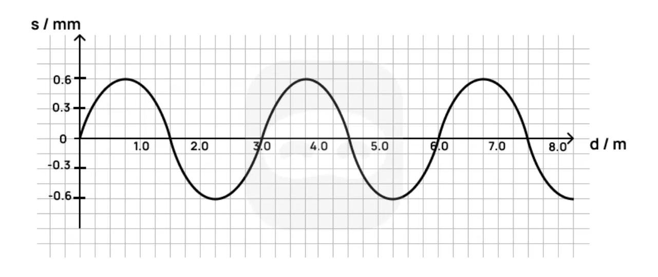 The graph shows the transverse displacement in millimetres of points on a stretched string as a function of distance in metres along the string at a fixed instant in time.