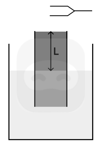 The diagram shows a vertical tube partially submerged in water. A tuning fork is held above the open end, and the air column length above the water can be adjusted. The setup is used to investigate the resonance of sound waves in a tube closed at one end (bottom) and open at the top.