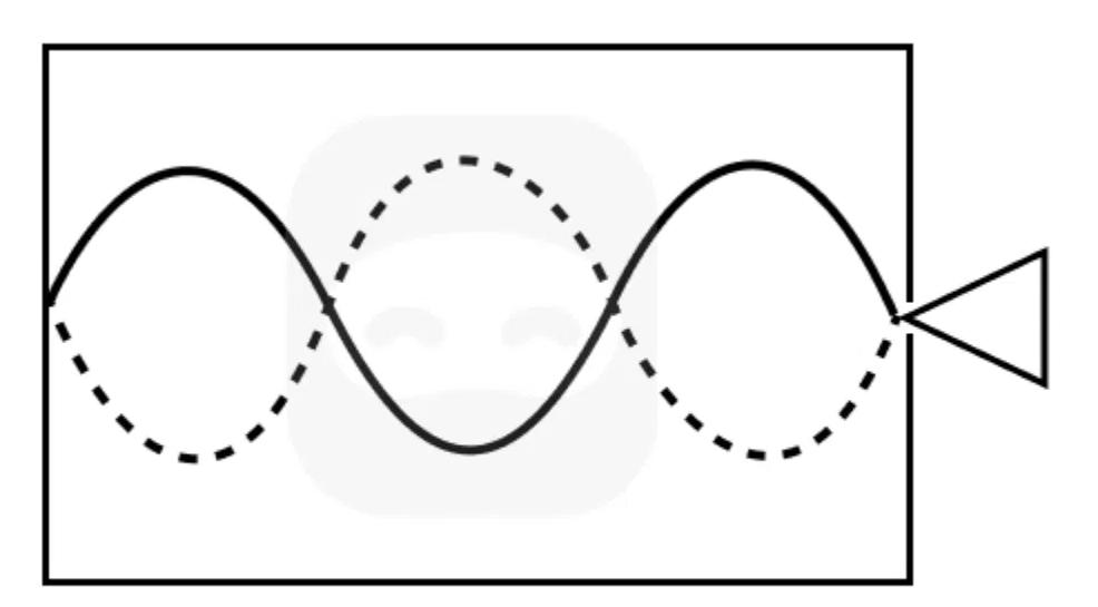 The diagram shows a wave moving along a string from left to right (solid line), followed by its reflection (dashed line) from the right-hand boundary. The two waves are of the same amplitude and frequency. This setup illustrates the formation of a standing wave.
