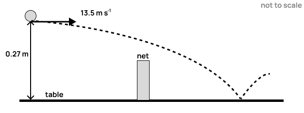 Two players are engaged in a game of table tennis. Player A strikes the ball at a height of 0.27 m above the table's surface, measured from the tabletop to the bottom of the ball. The ball's initial velocity is in the horizontal direction.