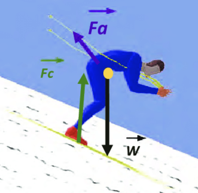 What type of muscle contraction takes place in the skier's quadriceps during the downhill skiing movement shown in the diagram?